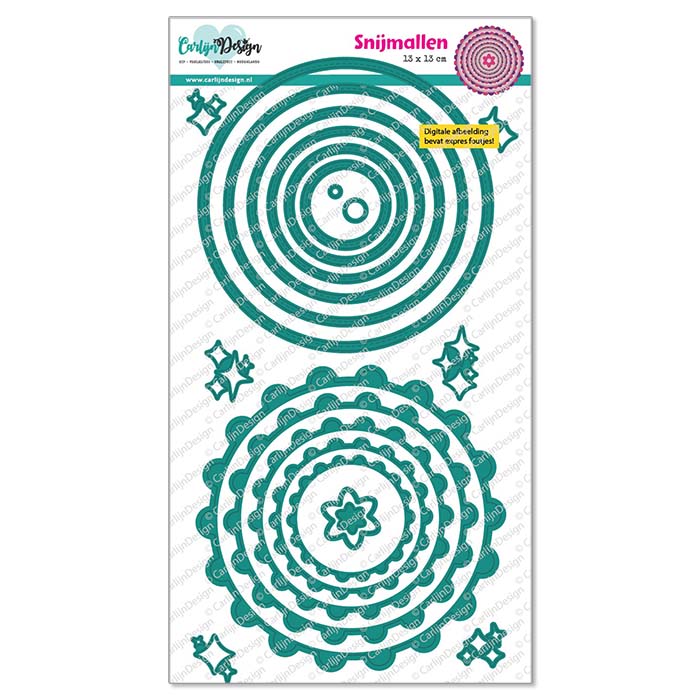 Een superhandige basisset met snijmallen 'Cirkels geschulpt', ontworpen door CarlijnDesign. De set bestaat uit geschulpte cirkels die je in 2 kleuren uitsnijdt en precies op elkaar plakt zodat de gaten dicht zijn. Daarnaast ook nog een set gewone cirkels met dubbele stitching, die perfect erop passen. De grootste cirkel is 13 x 13 cm.